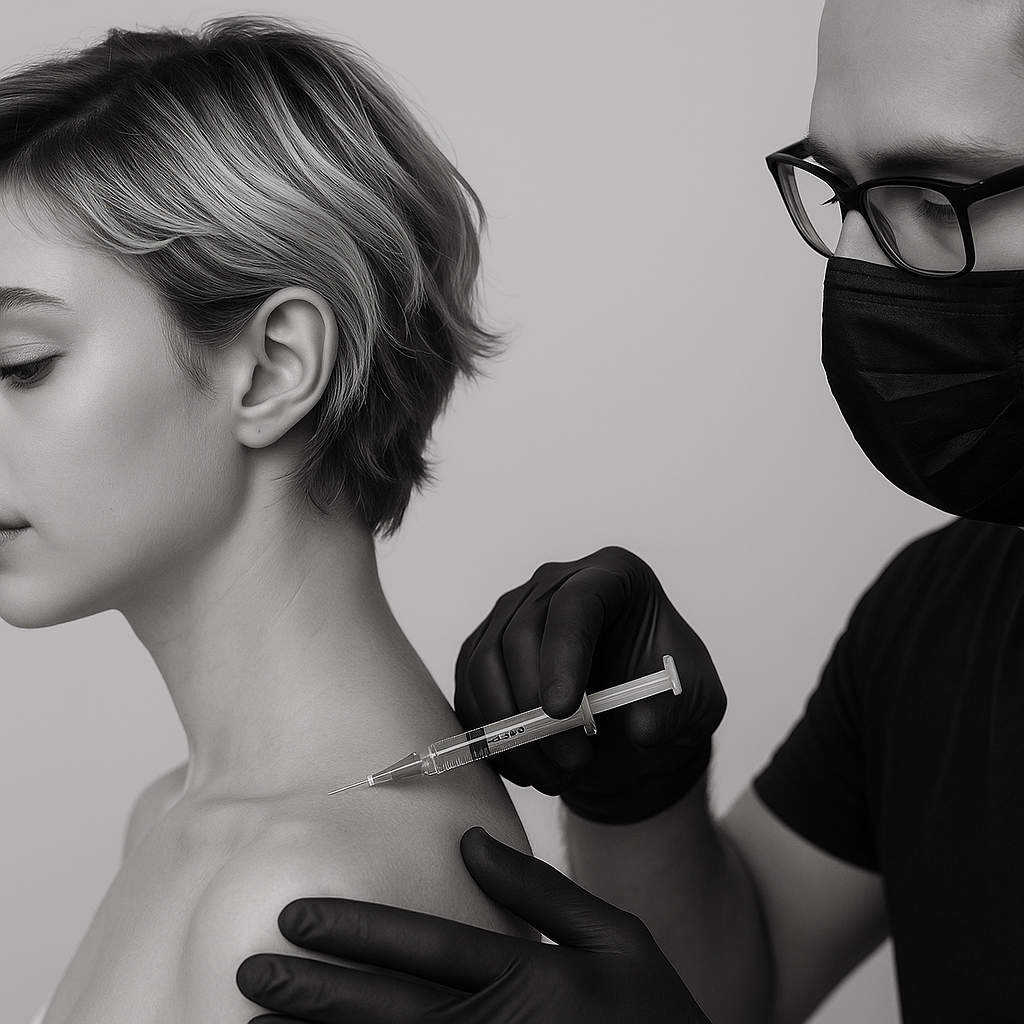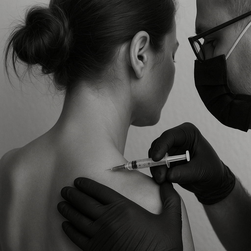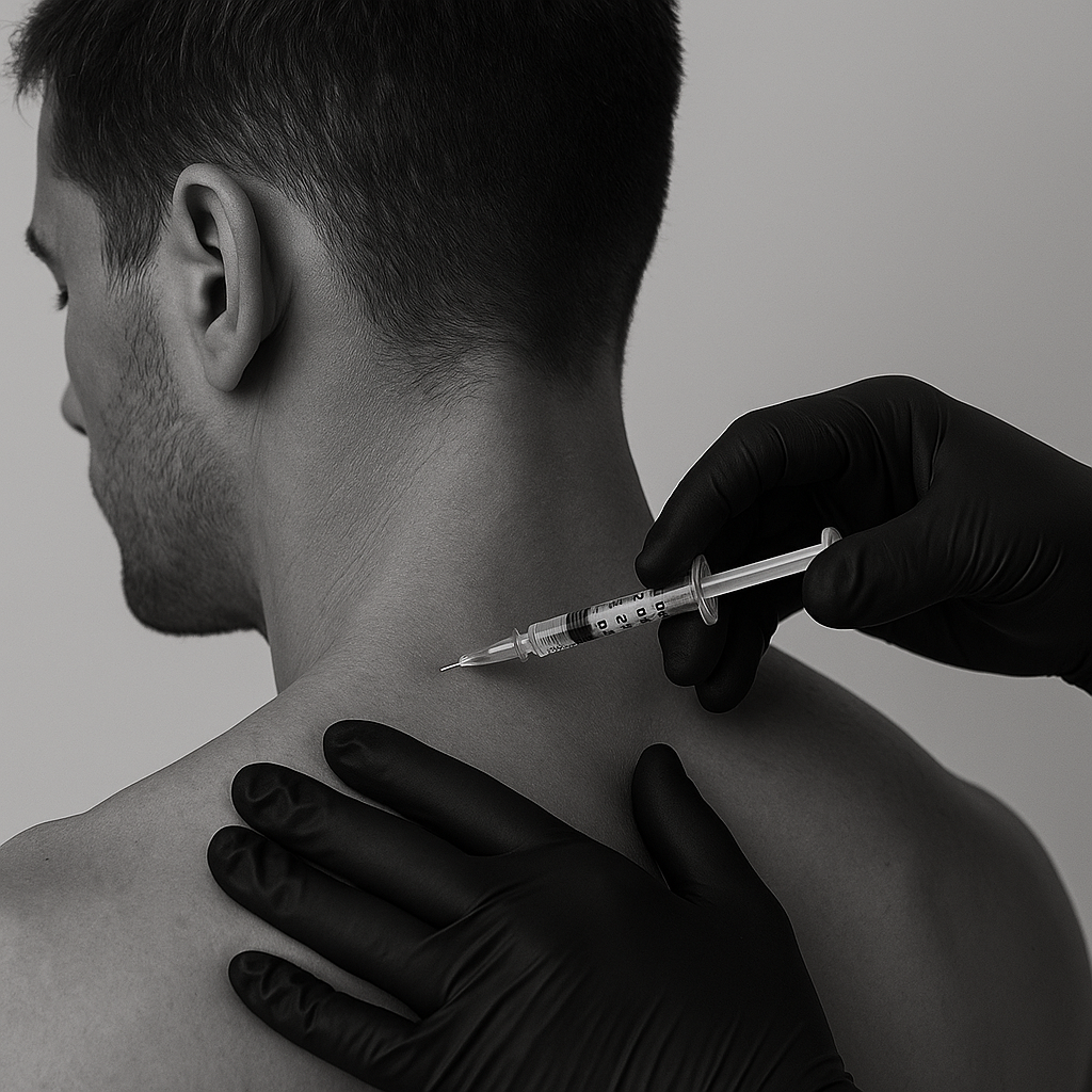 Botox® (botulinum toxin) works by relaxing the trapezius muscle at the neuromuscular junction. This softens the muscle, reduces hypertrophy, and elongates the neck line, with visible slimming by week 4–6 and pain relief that may last up to 6 months.